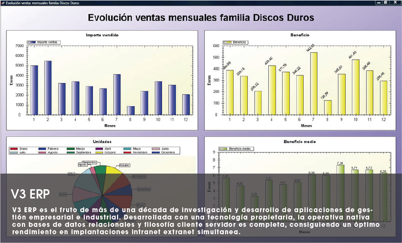 V3 ERP es el fruto de más de una década de investigación y desarrollo de aplicaciones de gestión empresarial e industrial. Desarrollada con una tecnología propietaria, la operativa nativa con bases de datos relacionales y filosofía cliente servidor es completa, consiguiendo un óptimo rendimiento en implantaciones intranet extranet simultanea. V3 ERP dispone de un entorno de trabajo robusto y resistente a cualquier tipo de operativa. Su filosofía modular ofrece una importante adaptabilidad a múltiples sectores económicos e industriales.