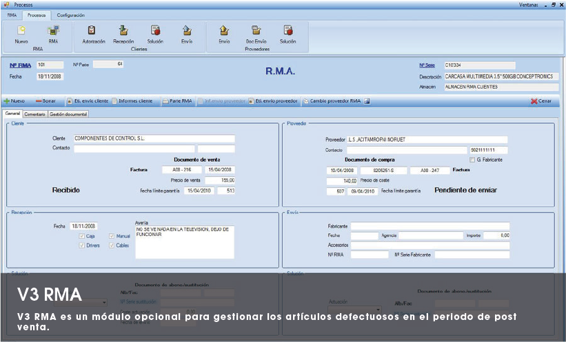V3 RMA es un módulo opcional para gestionar los artículos defectuosos en el periodo de post venta. Permite un control exhaustivo de la pieza defectuosa entregada por el cliente y el control posterior de la misma en la tramitación al proveedor o fabricante.