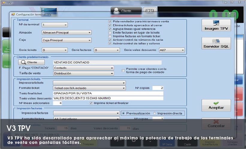 V3 TPV ha sido desarrollado para aprovechar al máximo la potencia de trabajo de los terminales de venta con pantallas táctiles.Terminal punto de venta es ideal para aquellas empresas que necesitan una venta rápida e intuitiva.